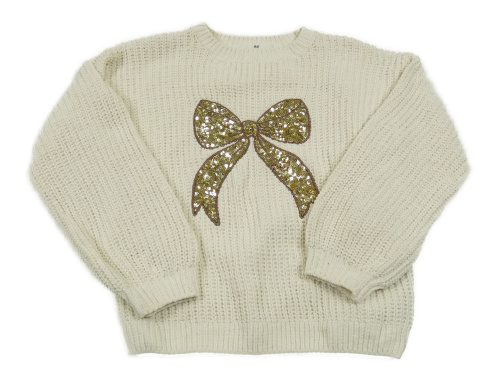 Smotanový rebrovaný žinylkový oversize sveter s mašlou s flitrami H&M