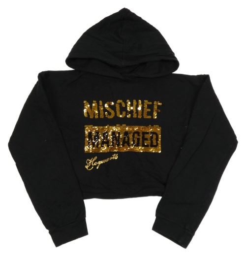 Čierna crop mikina so zlatým nápisem z flitrů a kapucňou
