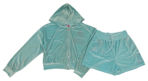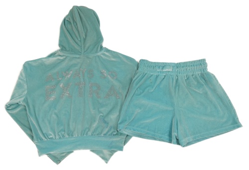 2Set - Mentolová zamatová prepínaci oversize crop mikina s logy z kamínků a kapucí + kraťasy Barbie