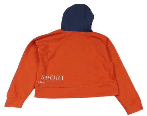 Červeno-tmavomodrá športová crop mikina s nápismi a kapucňou