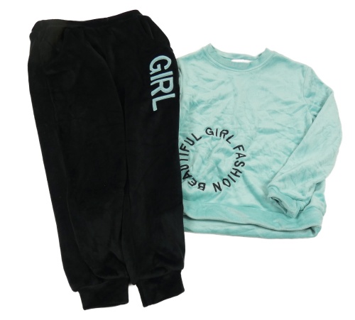 2 set - čierne plyšové tepláky s nápisem + zelená plyšová mikina s nápisom