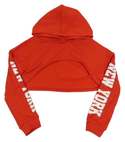 Červená crop mikina s nápisem na rukávech a kapucňou