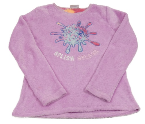 Lila plyšová mikina s flekem a nápisom