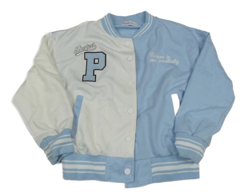 Světlemodro-biela baseballová mikina s nápismi a písmenem