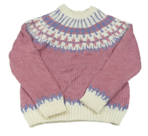 Starorůžovo-smetanovo-modrofialový pletený sveter so vzorom