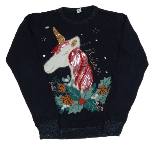 Tmavomodrý sveter s jednorožcom s flitrami a vánočním motívom Tu