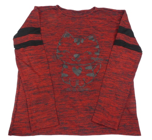Červeno-černé melírované úpletové mikinotriko s mačičkou a pruhmi