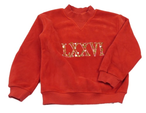 Červená plyšová mikina s čísly z flitrů