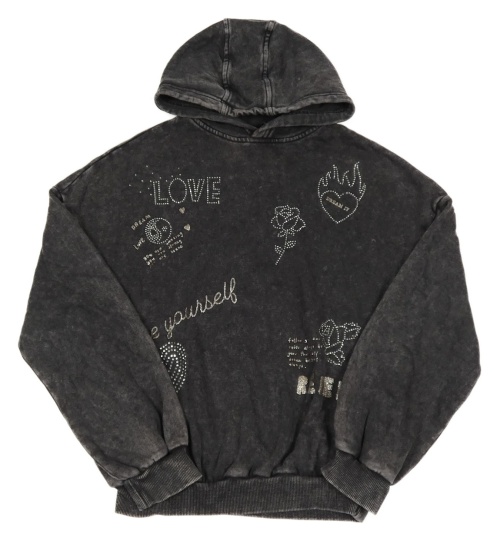 Tmavosivá šisovaná mikina s růžemi a srdíčky z kamínků a kapucňou George