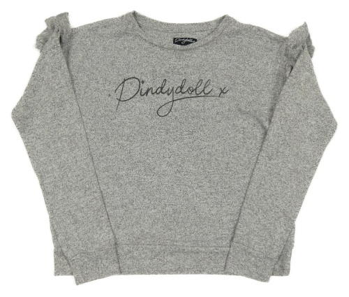 Sivý melírovaný sveter s nápisom a volánikmi Pindydoll