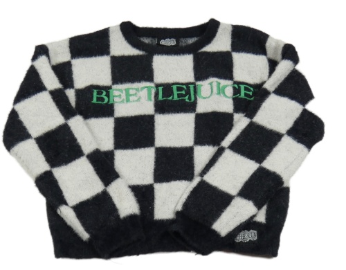 Čierno-svetlosivý kockovaný chlpatý crop sveter s nápisem - Beetlejuice Primark