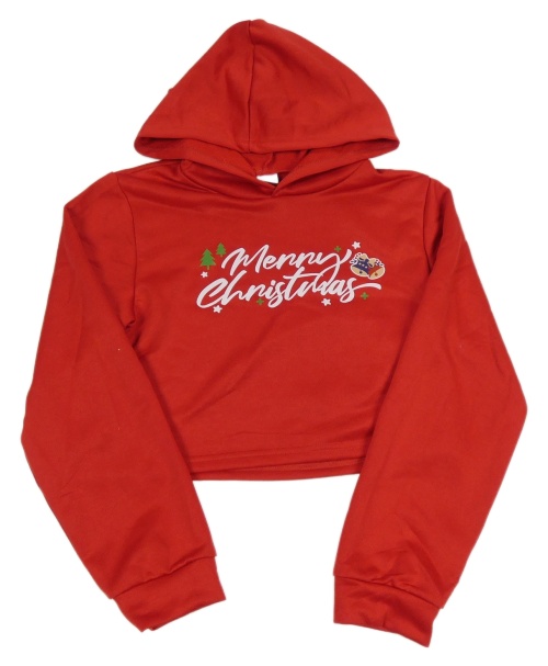 Červená vianočná crop mikina s nápismi a stromčekmi a zvonečky a kapucňou
