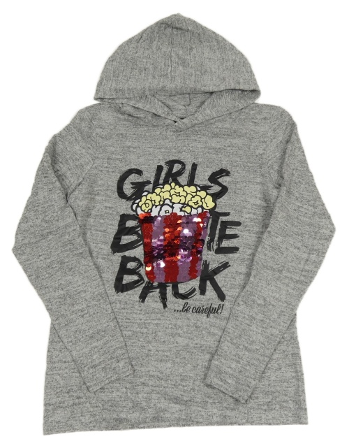 Sivý melírovaný pletený ľahký sveter s nápisom a popcornem a kapucňou Page one young