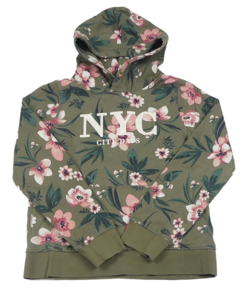 Khaki mikina s kvetmi a písmenky a vreckom a kapucňou H&M