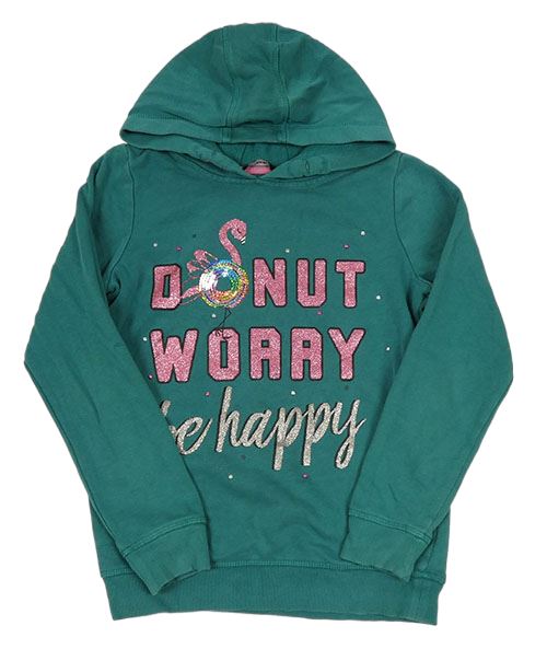Tmavozelená mikina s nápismi a flitrami a plameňákem a kamienkami a kapucňou George