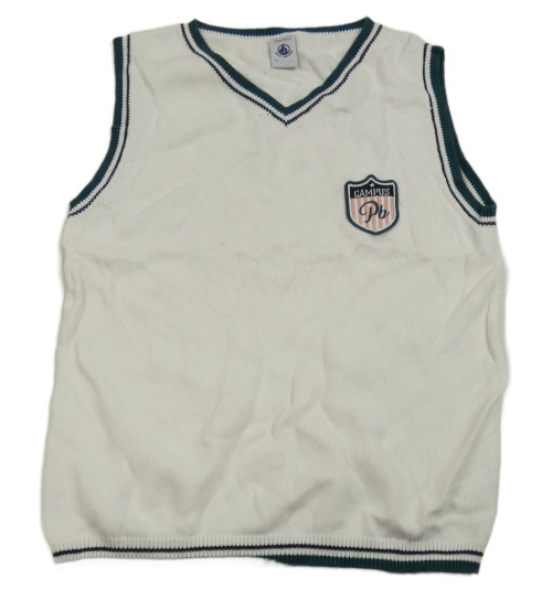 Biela svetrová vesta so zeleným lemem a nášivkou