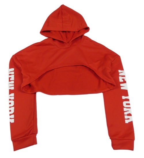 Červená crop mikina s nápisy na rukávech a kapucňou