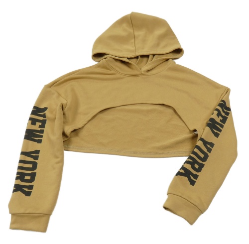 Béžová crop mikina s nápisem na rukávech a kapucňou