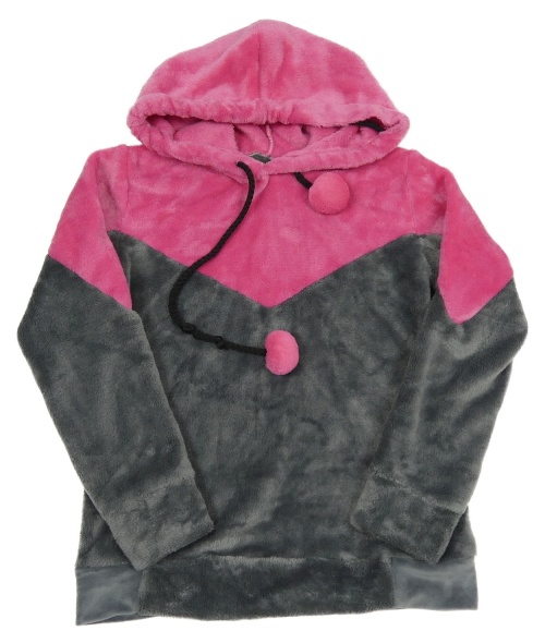 Ružovo-sivá plyšová mikina s kapucňou s bambulemi