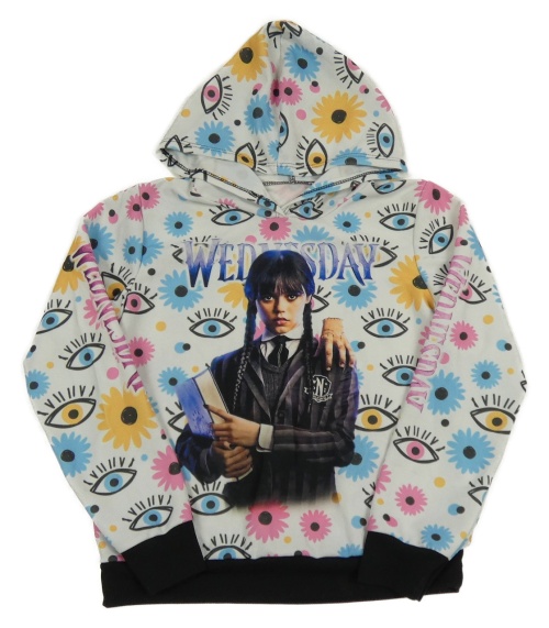 Bielo-barevno-čierna mikina s potiskem - Wednesday a kapucňou