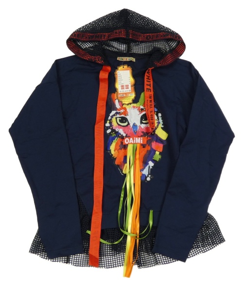 Nové - tmavomodrá mikina so sovičkou a perlami a sieťovaným volánikom a kapucňou SUME KIDS