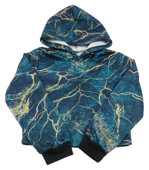 Zeleno-tmavomodro-žltá vzorovaná crop mikina s kapucňou