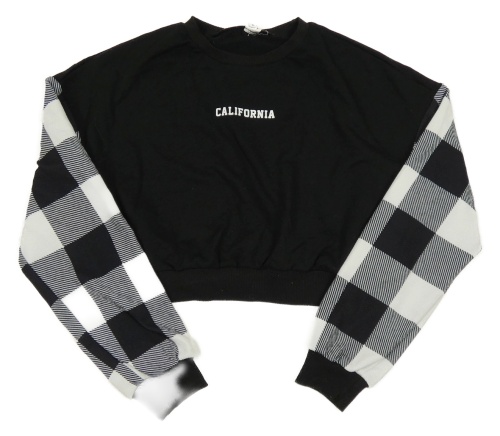 Čierno-biela crop mikina s nápisom a kockovanymi rukávy Shein