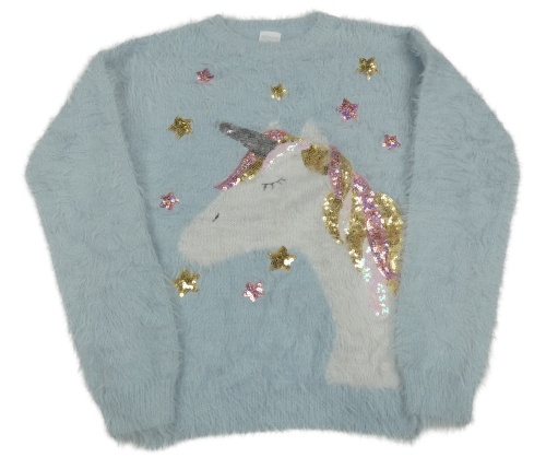 Svetlomodrý chlpatý sveter s jednorožcom a hvězdami z flitrů F&F