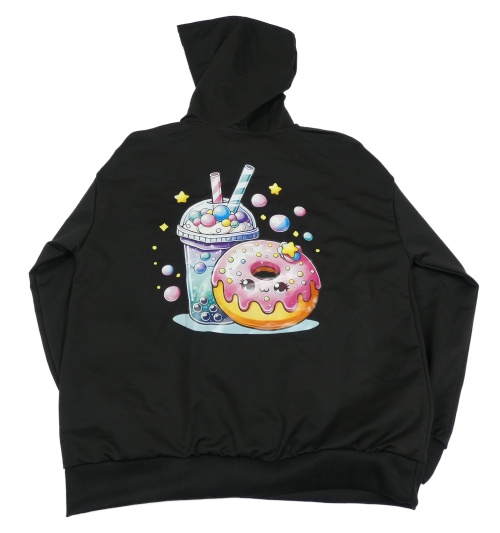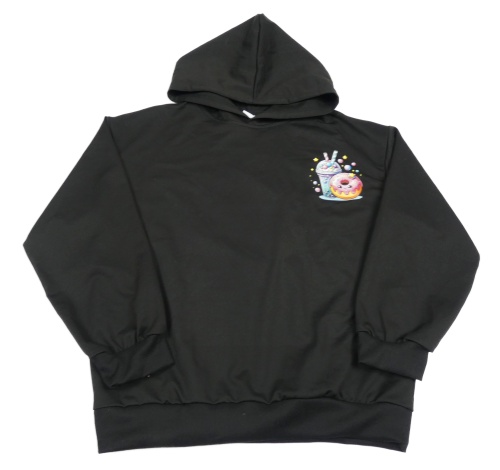 Čierna mikina s nápojem a donutem a kapucňou