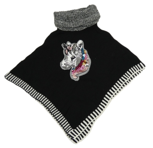 Čierno-sivé pletené svetrové pončo s jednorožcem z flitrů a rolákom