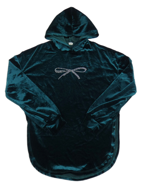 Tmavozelená zamatová tunika s mašlí z kamínků a kapucňou