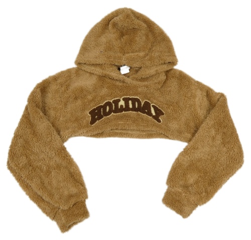 Hnedá chlpatá crop mikina s nápisom a kapucňou SHEIN
