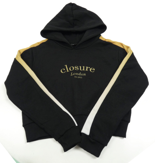 Čierna crop mikina s okrovým pruhom a nápisom a kapucňou
