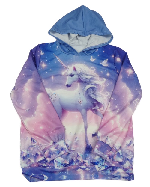 Fialovo-ružovo-modrá mikina s jednorožcom a kapucňou