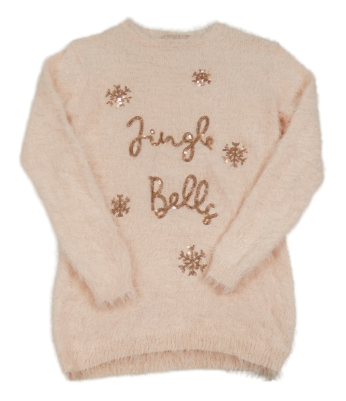 Svetloružový chlpatý dlhý sveter s nápisom a vločkami z flitrů Primark
