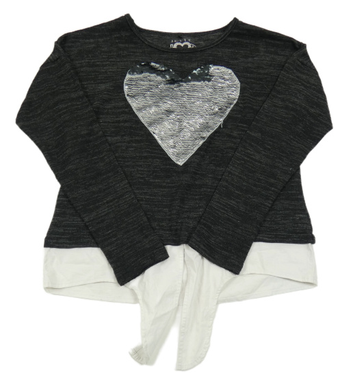 Tmavosivý sveter so všitou halenkou a srdíčkem z překlápěcích flitrů Staccato