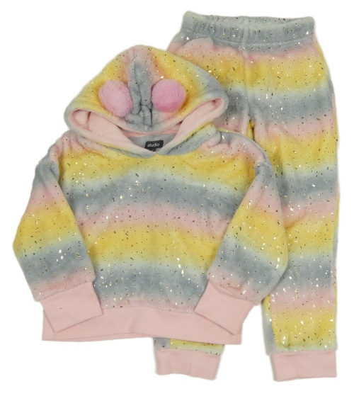 2set - Ružovo-modro-žltá plyšová trblietavá mikina s kapucňou a bambulemi + tepláky