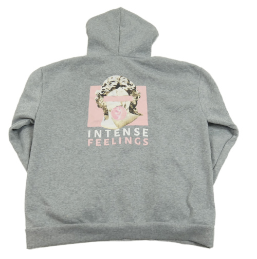 Sivá melírovaná tepláková mikina s vreckom a potlačou a kapucňou