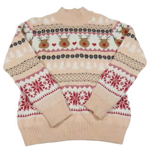 Broskvovo-biely vzorovaný vlnený sveter so sobmi a vzorom