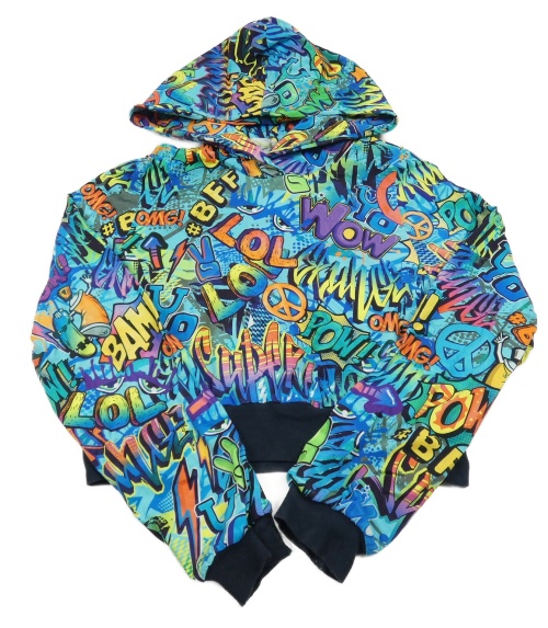 Modro-farebná ľahká crop mikina s nápismi a kapucňou