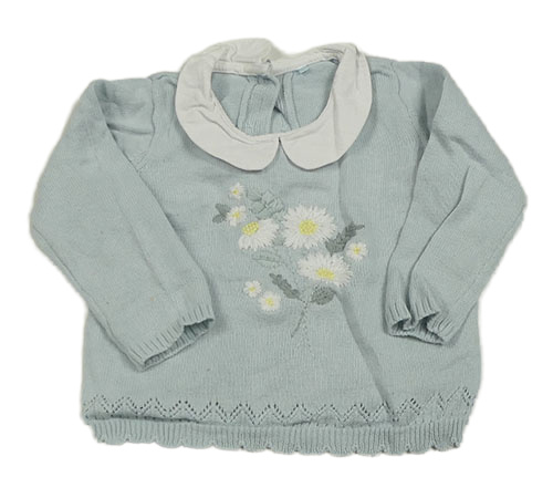 Svetlomodrý sveter s kvietkami a perforovaným vzorom a bielým golierikom Tu