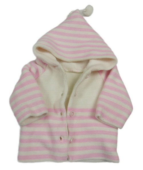 Ružovo-biely pruhovaný pletený prepínaci zateplený sveter s kapucňou s bambulkami
