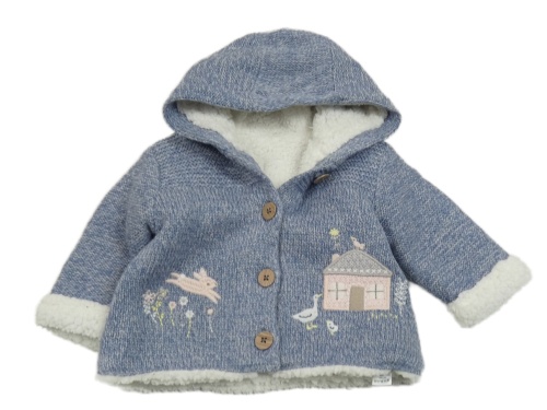 Modro-biely melírovaný pletený prepínaci zateplený sveter s domečkem a zvířátky kapucňou Nutmeg