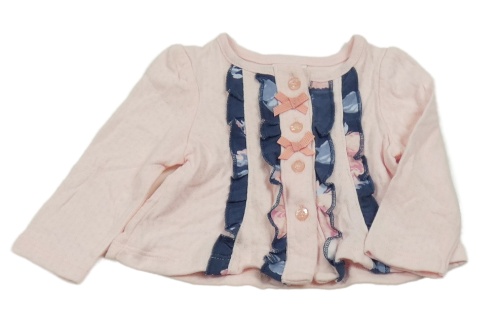 Svetloružová vzorovaná prepínaci slabá mikina s tmavomodrymi volániky a mašľami LAURA ASHLEY