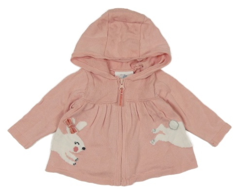 Svetloružový prepínaci sveter s králikom a kapucňou Topomini