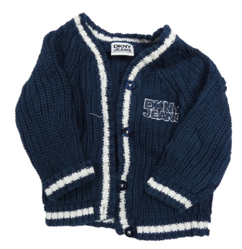 Tmavomodrý prepínaci sveter s nápisom DKNY