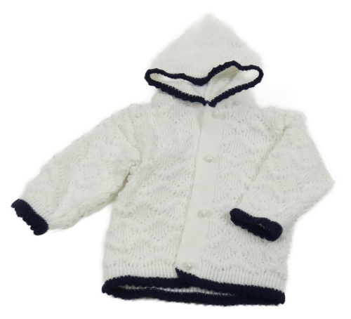 Biely vzorovaný prepínaci sveter s tmavomodrým lemem a kapucňou