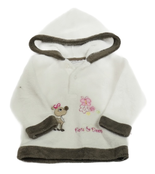 Biela plyšová mikina s hnědým lemem a kolouškem a kapucňou