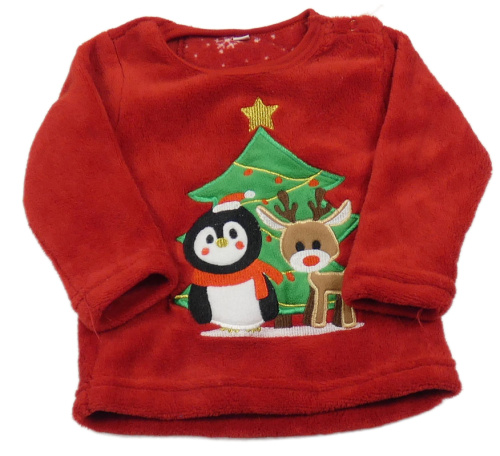 • Červená plyšová mikina s vánočním stromčekom a tučňáčkem a sobom