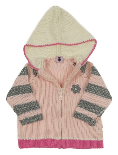 Svetloružová -ružovo-sivý pletený prepínaci sveter s květem a pruhmi a kapucňou